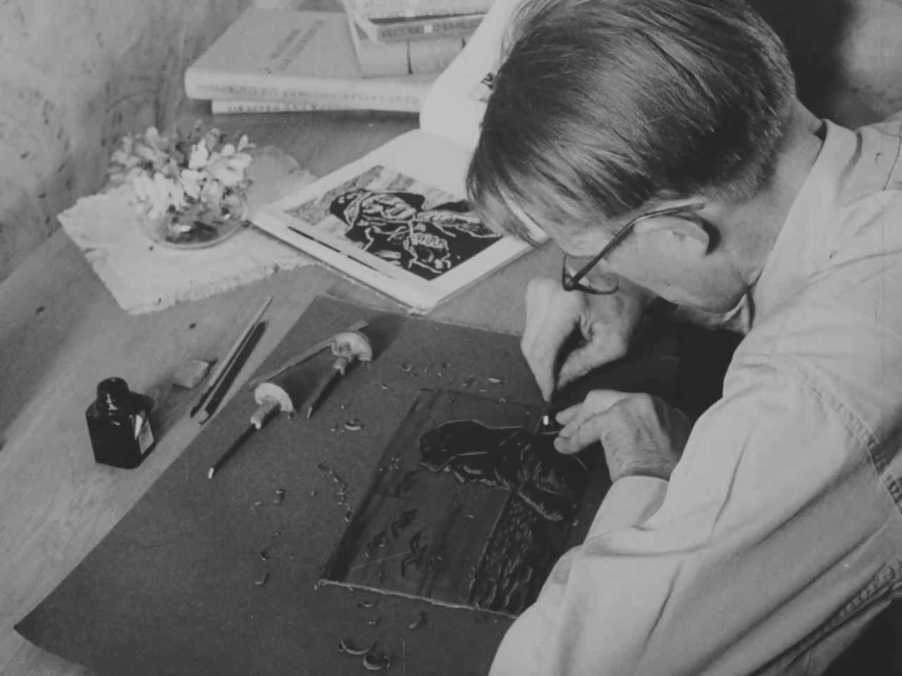 Portreepala V. Kingissepa nimelise kolhoosi põllutöölisest ja harrastuskunstnikust Johannes Kangrost. Tema käe all valmivad linoollõiked, illustratsioonid ja eksliibrised. Kahel korral nädalas käib Kangro Kiviõli pioneeride majas kunstiringi juhendamas.