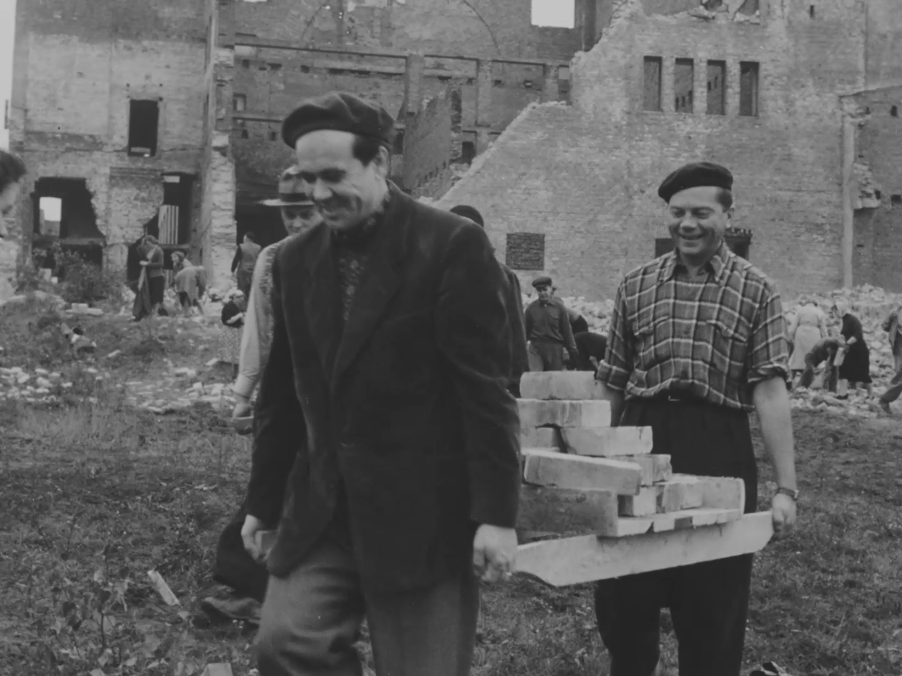 Tartu Vanemuise varemete korrastamine enne 19.05.1959, mil varemed õhiti. Orkestriga rongkäik Tartus Vanemuise tänaval, inimesed suunduvad Vanemuise varemeid koristama.