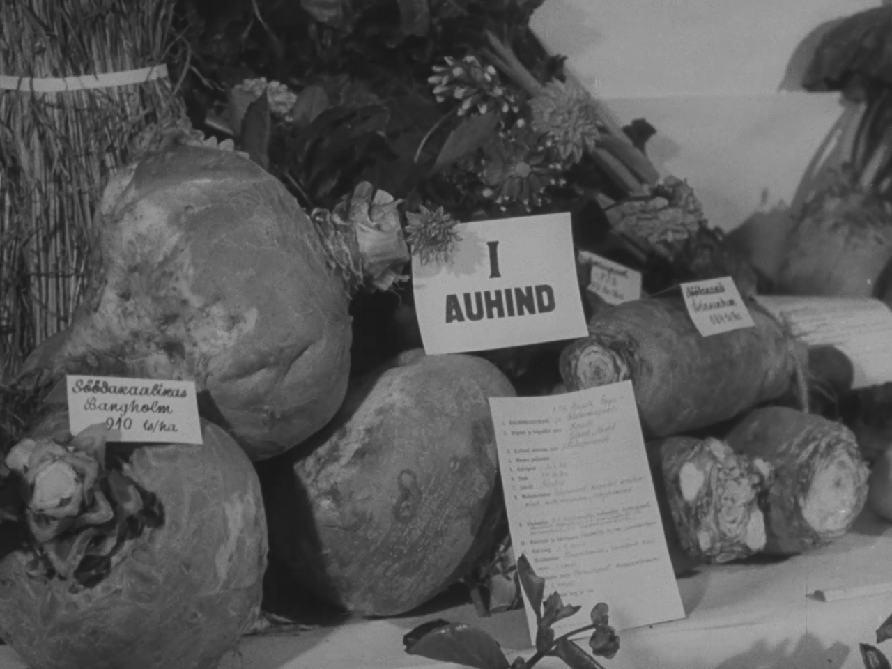 Tartu rajooni põllumajandusnäitus Luunja sovhoosis. Kaadris on peamiselt auhinnatud juur- ja puuviljad: kapsapead, kaalikad, kartulid, õunad, isegi viinamarjad